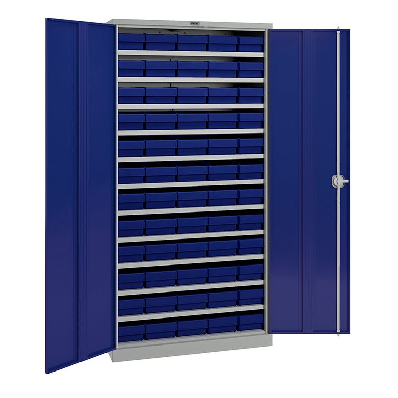 Корпус шкафа, полки – серый (RAL 7038, шагрень), двери – синий (RAL 5002, шагрень)