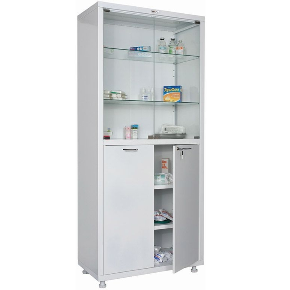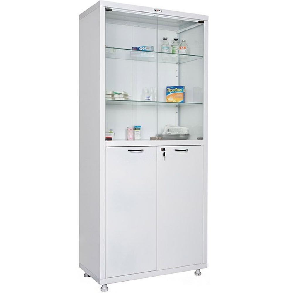 Шкаф медицинский HILFE MD 2 1780/SG подойдет для хранения медицинских инструментов, медикаментов и документации. Для изготовления корпуса используется листовая сталь с порошковым покрытием. Ниша разделена на два отделения. Две полки и двойная дверь верхнего отделения изготовлены из каленого стекла, дверь оснащена магнитными защелками. Нижний отдел оснащен двумя полками и стальной двойной дверью с ключевым замком. Регулируемые по высоте опоры позволяют устанавливать шкаф на неровной поверхности.